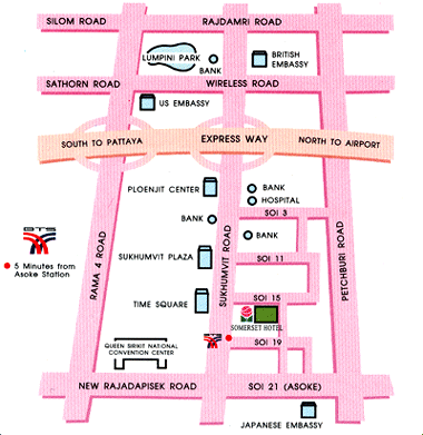 and conveniences. The Somerset has just 87 rooms and suites. Particular care has been taken with each one, no detail has been neglected in giving them the warm feeling of home, and all are furnished with a full set of modern amenities, everything you've come to expect from a quality hotel. The Somerset Hotel is located in central business area and shopping center on Sukhumvit Road. Very close to BTS Skytrain Asoke Station and express way to Bangkok International Airport. Somerset Hotel Bangkok | Map |