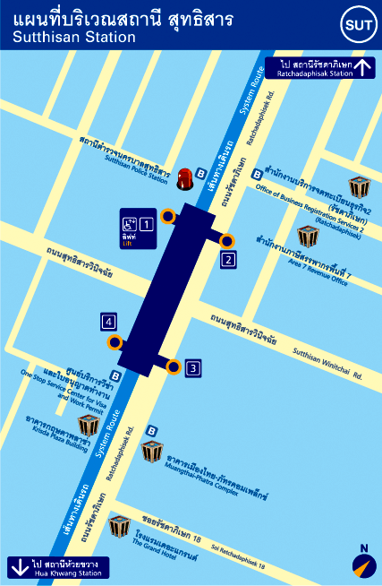 along Ratchadaphipek Road on Sutthisan Intersection.   picture from www.bangkokmetro.co.th 1. Sutthisan Police Station 2. Soi Ratchadaphisek 20 3. Soi Ratchadaphisek 18 4. One Stop Service Center for Visa and Work Permit M.R.T. Route Map |