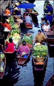 of long tail boats selling local produce, fruit, vegetables, souvenirs