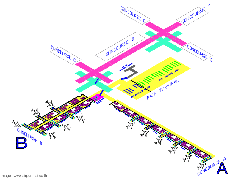 complex. The concourse buildings A and B are for domestic passengers. Details are as follows: - Concourse building A is for domestic passengers, with the length of approximately 432 meters. This building can accommodate 6 aircrafts and has 1 connection channel that allows access to the remote parking bays. - Concourse building B is for domestic passengers, with the length of approximately 270 meters. This building can accommodate 6 aircrafts and has 2 connection channels that allow access to the remote parking bays. The Concourse buildings C,D,E,F and G are for international passengers. Details are as follows: - Concourse building C has the length of approximately 459 meters, and can accommodate 10 aircrafts with 2 connection channels to access to the remote parking bays. - Concourse building D has the length of approximately 909 meters, and can accommodate 8 aircrafts with 2 connection channels to access to the remote parking bays. - Concourse building F has the length of approximately 270 meters, and can accommodate 6 aircrafts with 2 connection channels to access to the remote parking bays. - Concourse building G has the length of approximately 432 meters, and can accommodate 5 aircrafts with 1 connection channel to access to the remote parking bays. VIP lounge also situated at this building. The intersections of the concourse buildings are termed the airside center. There are 2 intersections on 3rd and 4th floors which will be used for shops; the exterior of the concourse buildings will be developed into airline offices and airline lounges. 5. Passenger Flow 5.1 International passengers flow 5.1.1 Departure passengers can come through via the entrance on the 4th floor of the departures hall, which can be accessed by car or by foot from the car parking buildings, which is connected to the 3rd floor of the departures hall. Upon entering the departures hall, passengers can check-in at counters 4-10 before proceeding to the passport control and the customs control checkpoints. Passengers can then continue to the concourse building D via 2 connection channels from the terminal complex. The 4th floor of concourse building D consists of a wide variety of shops that passengers can enjoy shopping while waiting for board. When called for boarding, they can approach the gate via the 3rd floor of the departures hall; and when arrive at the gate, they have to proceed to the 2nd floor to the hold room.All passengers and hand luggage taken on board must be examined. The examination points are on 3rd and 4th floors in the airside area of the concourse buildings. 5.1.2 Arrival passengers can come through to the passenger terminal on 2nd floor of the concourse buildings except the bus gate passengers. At the terminal, there will be passport control checkpoints and this is also a place where they collect their baggage from on of the 22 baggage conveyor belts, 17 of which are for international passengers and 5 are for domestic passengers. Once passengers have collected their baggage and passed the customs control checkpoints, they can proceed to the arrivals hall where they can find transportation counters, hotel and accommodation counters and tourist information center. Outside the arrivals hall will be pick-up points; in the case of passengers traveling with tour agency, they must proceed to 4th floor for buses and coaches. There is a general meeting point on 3rd floor. 5.1.3 Transit/transfer passengers will have to go to the airside area after they arrive at the 2nd floor of the concourse building from the aircraft in order to proceed with the transfer processes before continuing to 3rd and 4th floors to complete the departure procedures. In the case of transit passengers, they will have to go through the airside area to the departures service area in order to complete the departure procedures. 5.2 Domestic passengers flow 5.2.1 Domestic departure passengers will be able to check-in at counters 2 and 3 on 4th floor of the departure hall. Afterwards they will have to proceed to 2nd floor to the hold room where they and their hand luggage will be examined. 5.2.2 Arriving passengers will come to the terminal through the 2nd floor of the concourse building to collect their baggage from the 5 domestic baggage conveyor belts before proceeding to the arrival hall. The service counters outside the arrival hall will be shared by both the domestic and the international passengers. 6. Road Network 6.1 Road networks within landside There are 5 access routes to passenger terminal complex from the road networks within the landside. 6.1.1 Access route from the North Passenger terminal complex can be accessed from the North entrance via the motorway. The elevated frontage of the terminal is divided into inner and outer parts for both the arrival and the departure halls. 6.1.2 Access route from the Northwest Passenger terminal complex can be accessed from the Northwest entrance via the Rom Klao elevated highway and King Kaew Road which will pass the customs free zone before arriving at the terminal. 6.1.3 Access route from the South Passenger terminal complex can be accessed from the South entrance via the Bang Na-Trat highway and the service road which will pass the long term parking area and the public transportation center before arriving at the terminal. 6.1.4 Access route from the Northeast Passenger terminal complex can be accessed from the Northeast entrance via the Lad Kra Bung (Onnuj Road), then through the East-West main service road within the airport, the long term parking area and the public transportation center before arriving at the terminal. 6.1.5 Access route from the West Passenger terminal complex can be accessed from the West entrance via King Kaew Road. 6.2 Road networks within airside, the area which features runways, taxiways, aircraft parking space, ground equipments and services for aircrafts and baggage management area. There are 4 access routes from landside to airside. 1st access route is